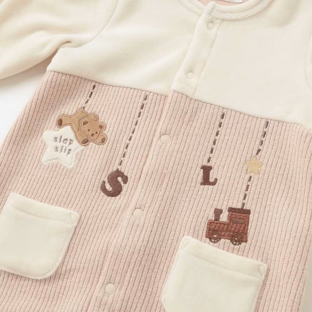 クマさんとSL機関車のパッチ刺しゅうが印象的な2WAYオール。