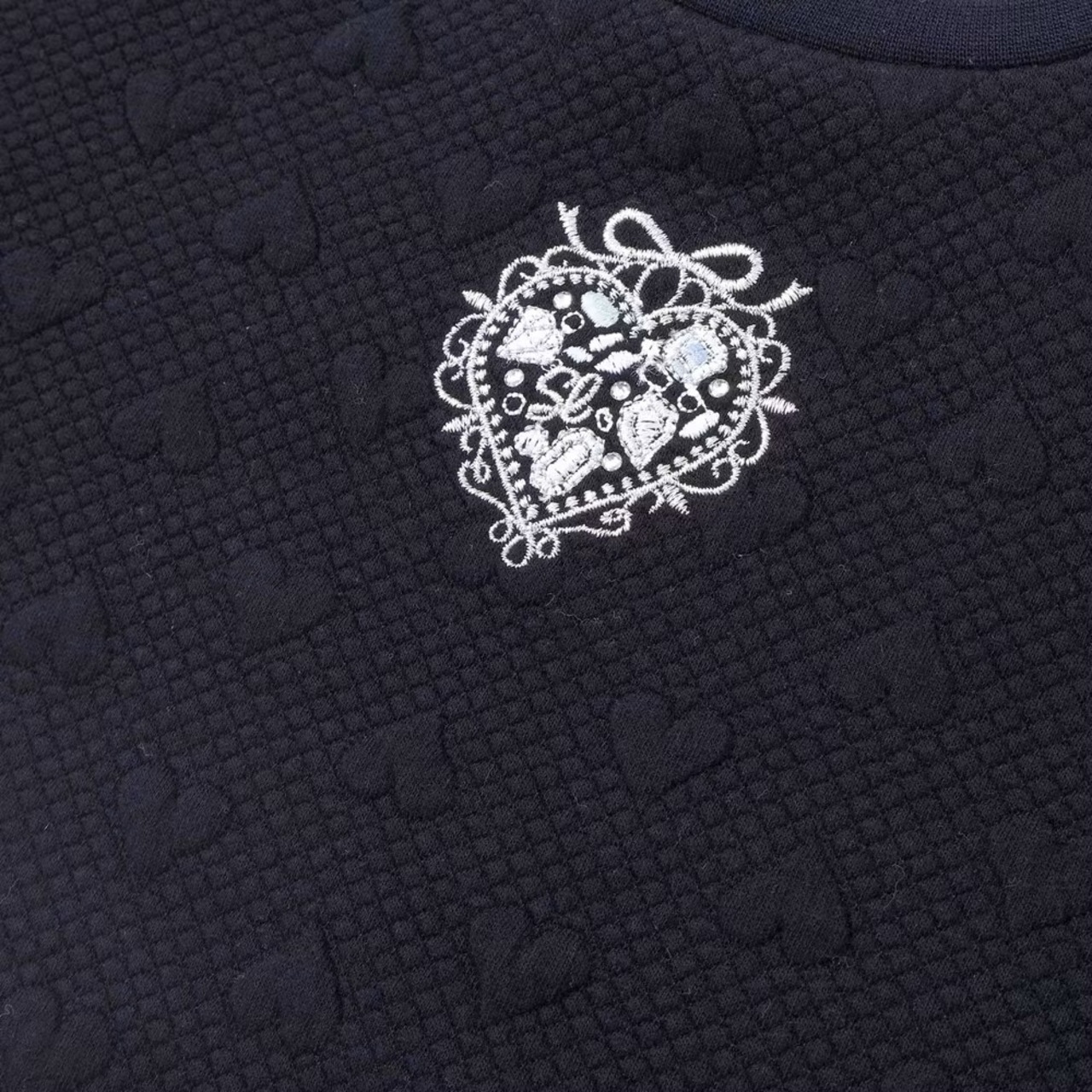 フロントにはラメ糸の刺しゅうとラインストーンで描かれたハートのレリーフがきらりと輝く!