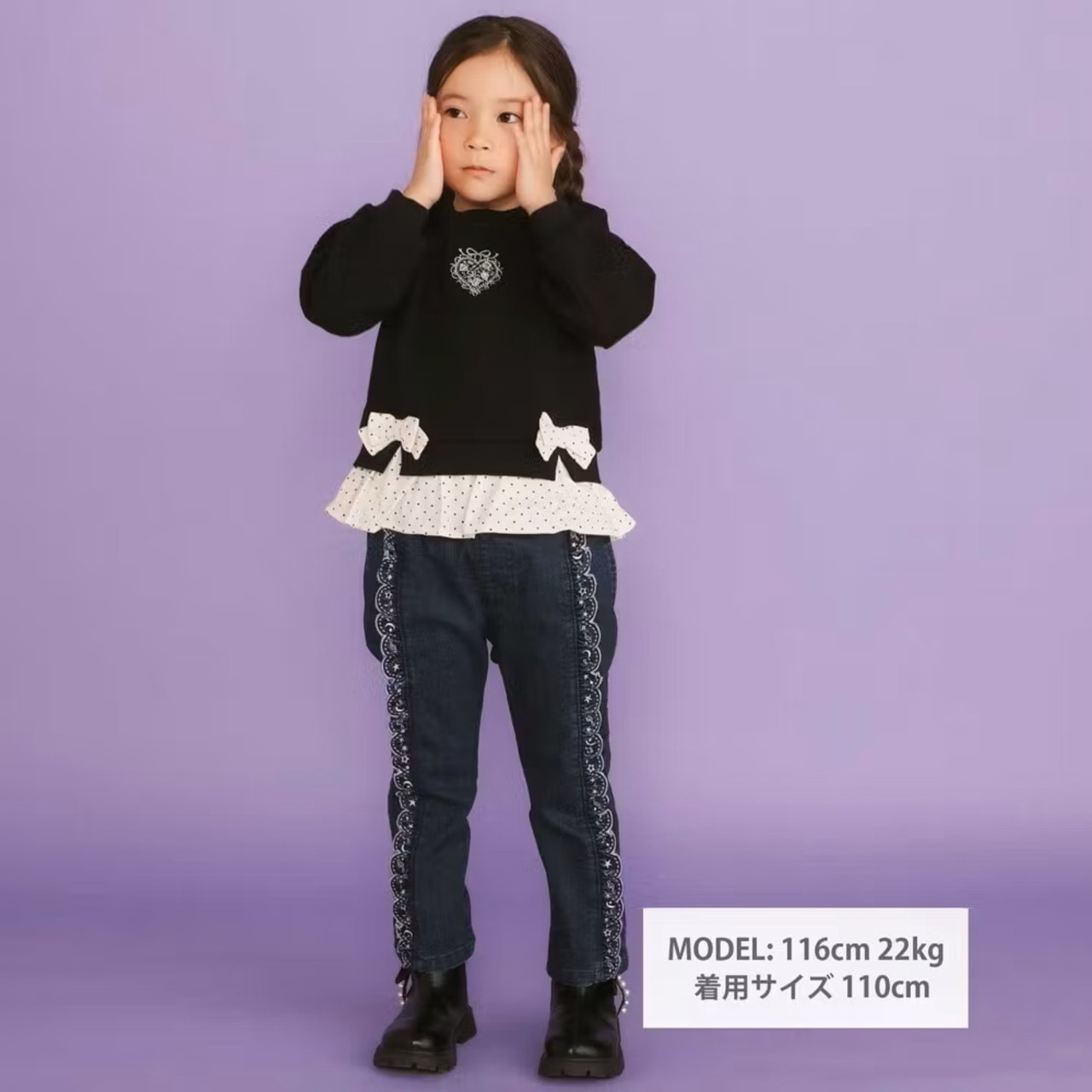 裾にはドットプリント柄のコーデュロイフリルとリボンがあしらわれ、可愛らしいデザインお♪