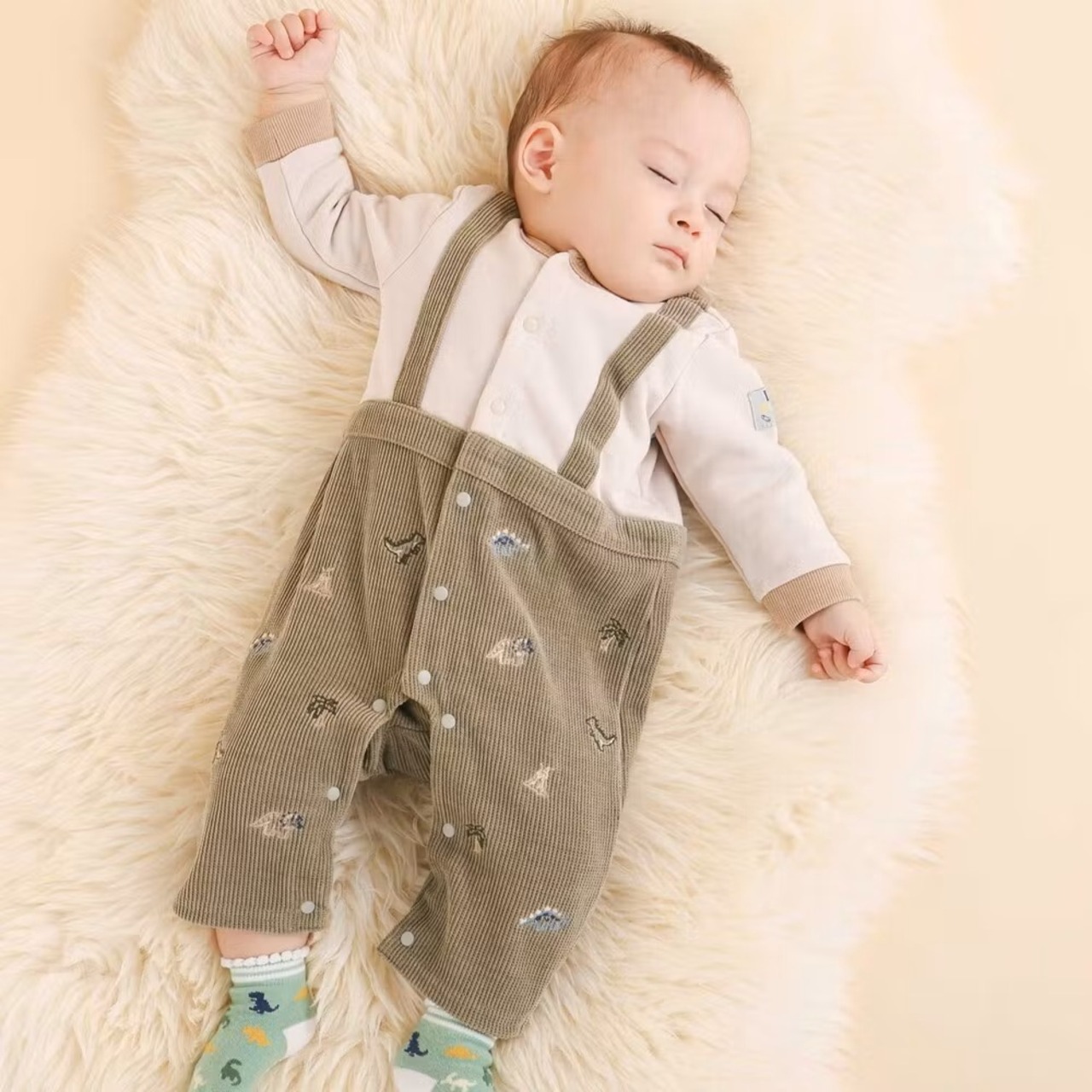 サロペット風のドッキングデザインがオシャレなロンパース。