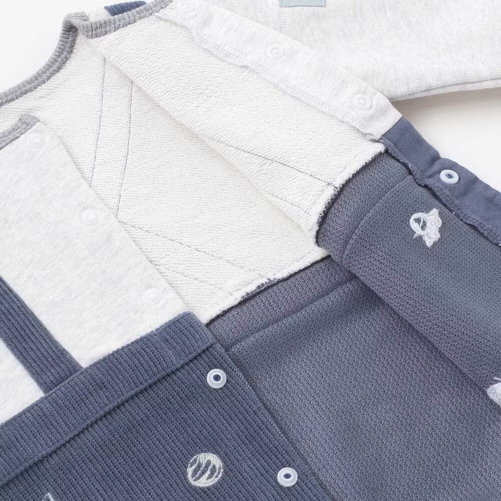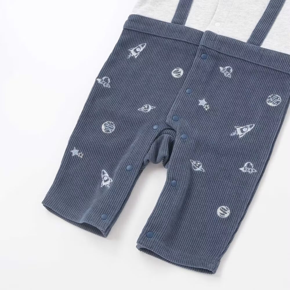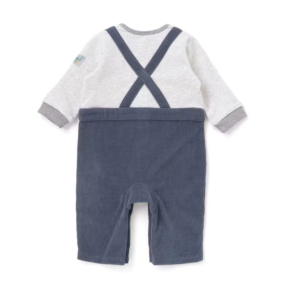サロペット風のドッキングデザインがオシャレなロンパース。
