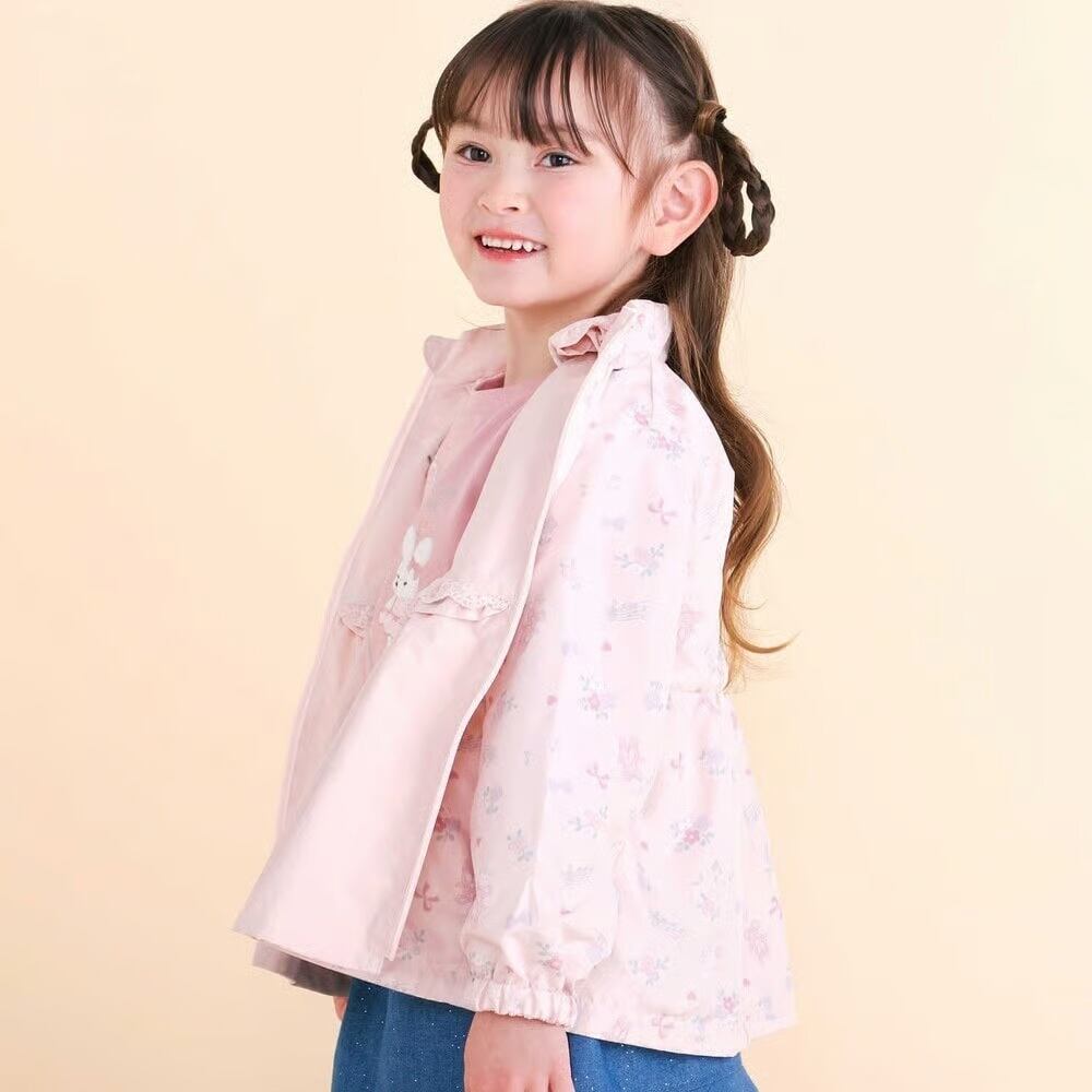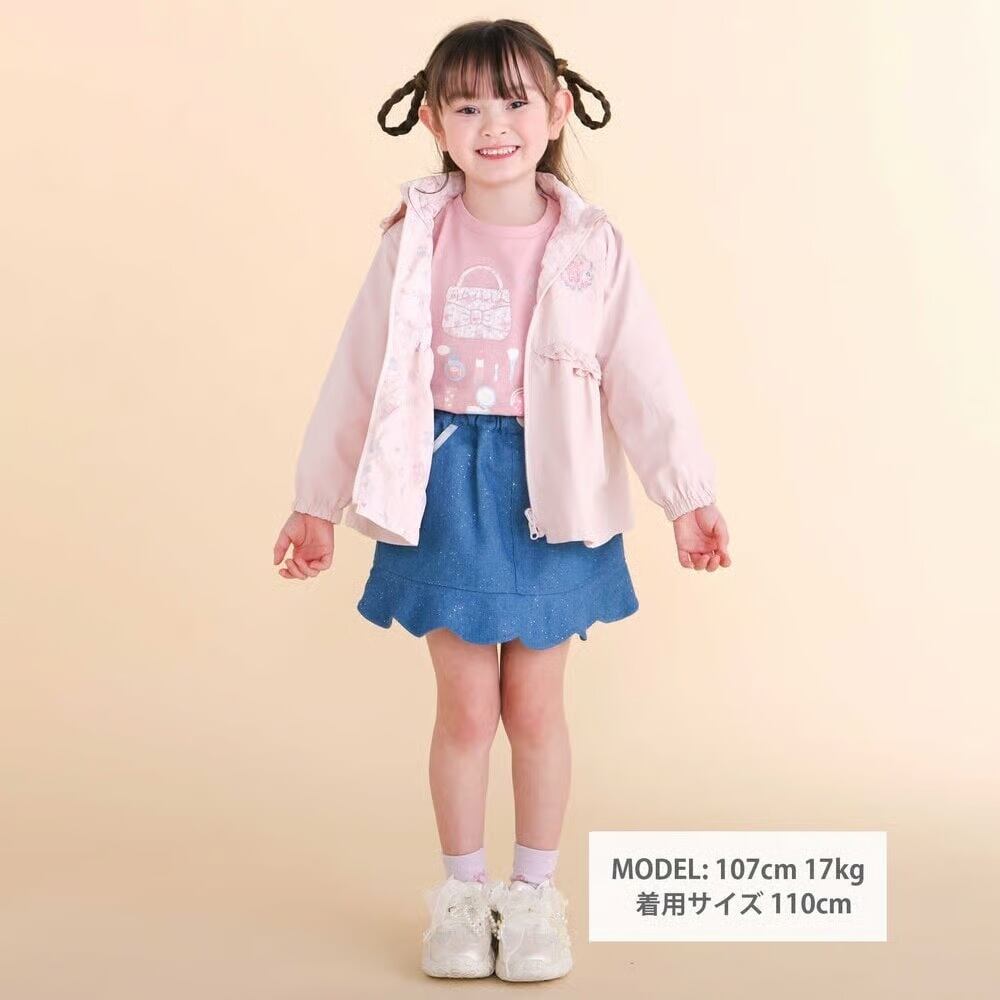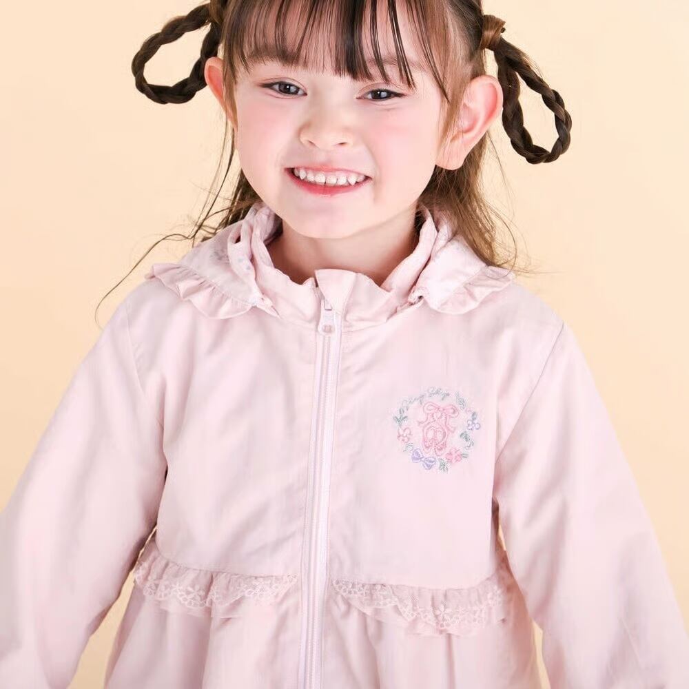 表面:左胸元にリボンやお花の刺しゅうを、フロントの切り替え部分にはフリルとレースをプラス。