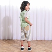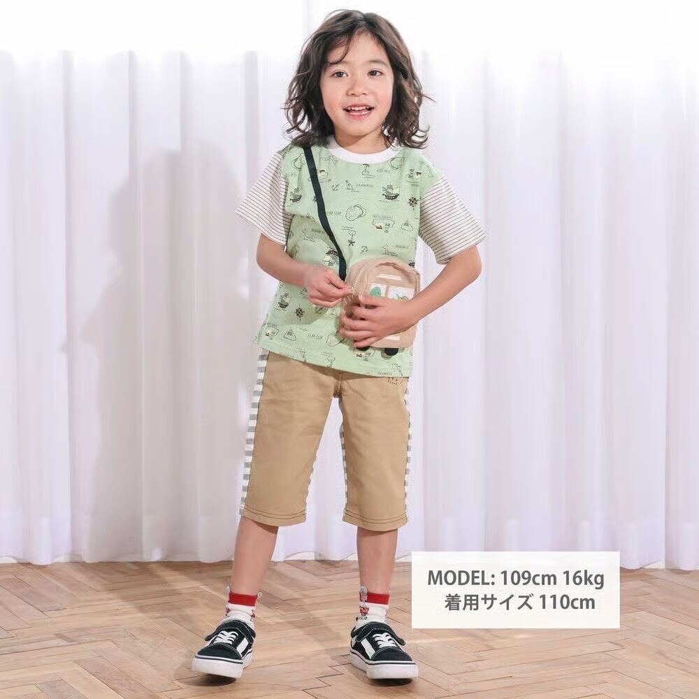 恐竜や船、島、火山、コンパスなどをモチーフにした総柄にストライプ袖がアクセント!